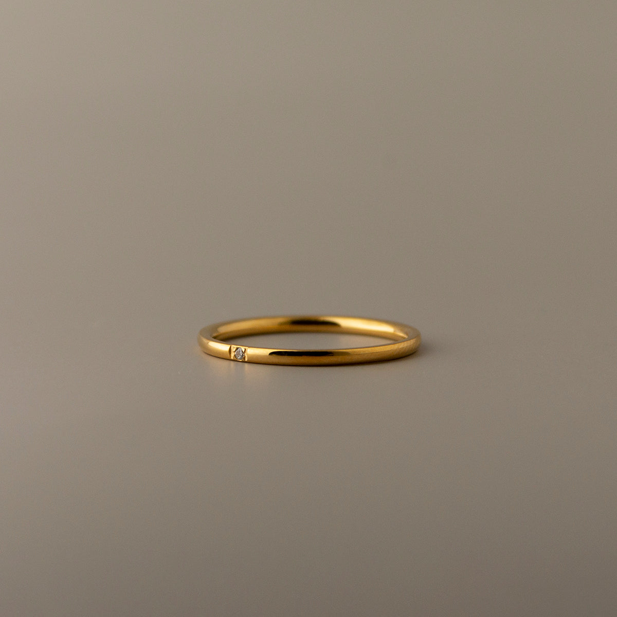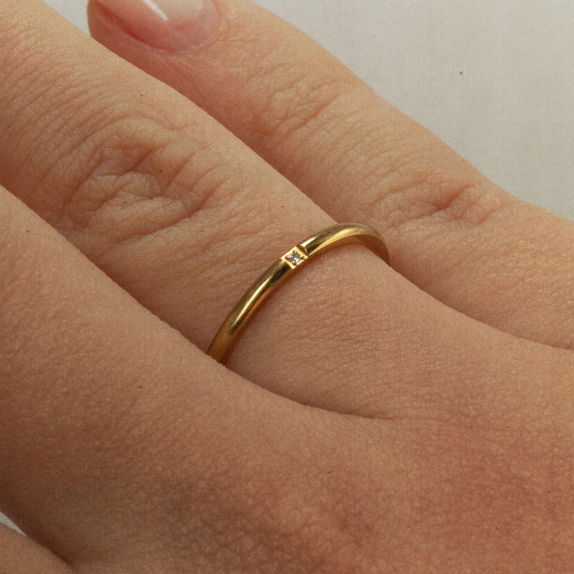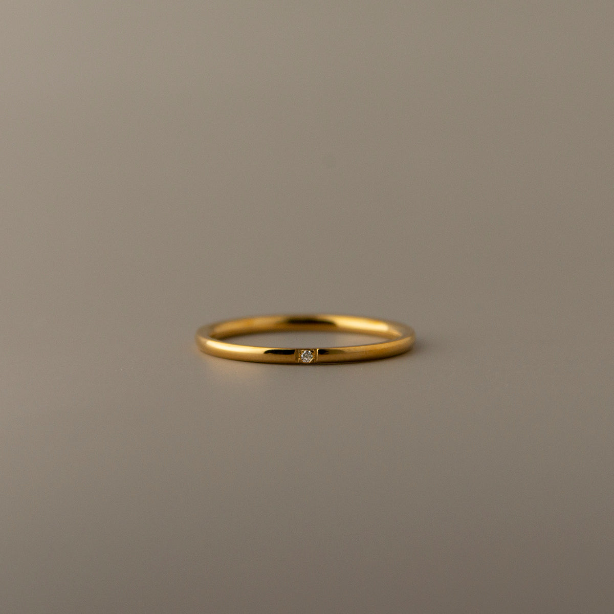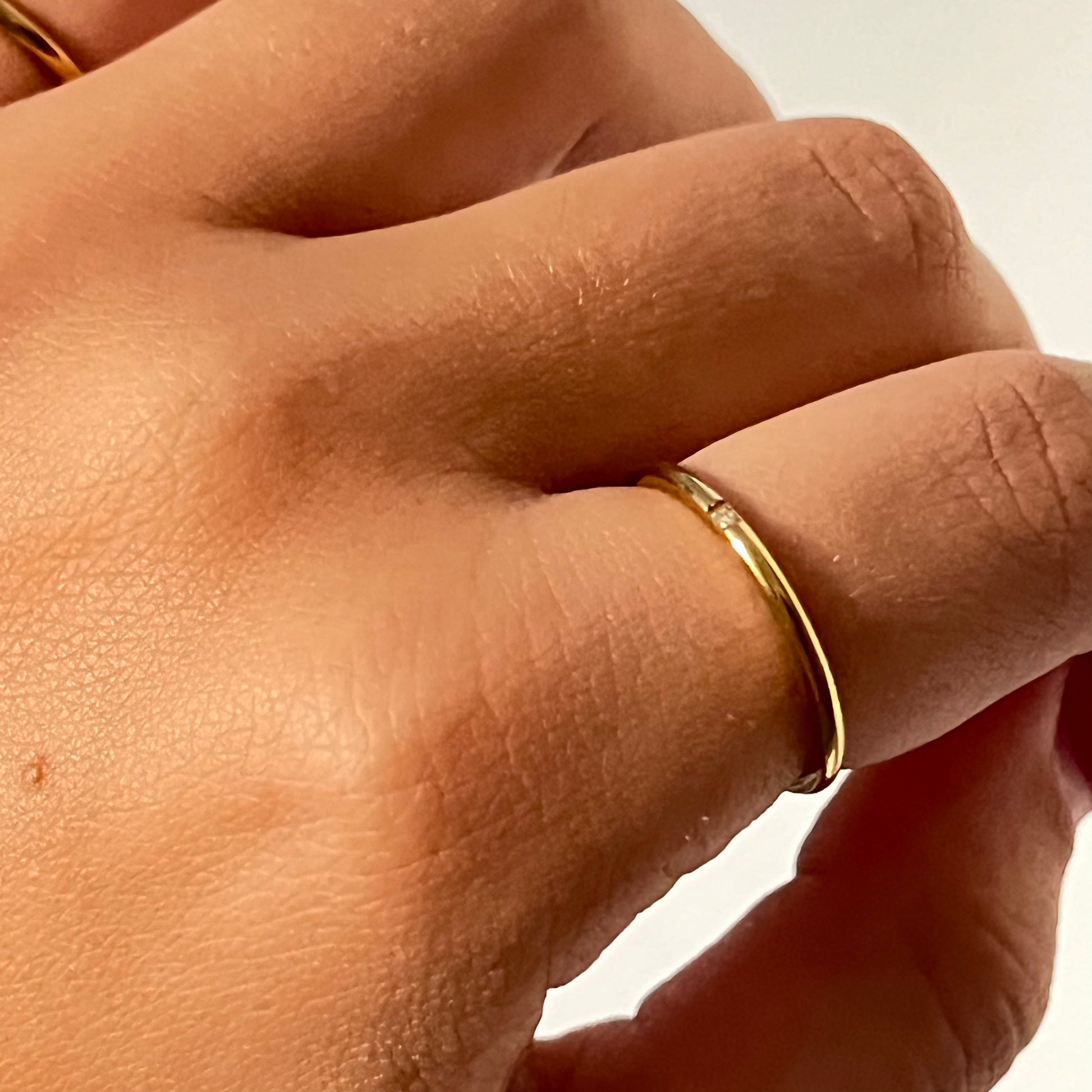 L'anello, sottile e delicato è impreziosito da un singolo brillante che cattura e riflette la luce con grazia. La sua presenza luminosa è come un'emozionante promessa, un bagliore di speranza e bellezza.